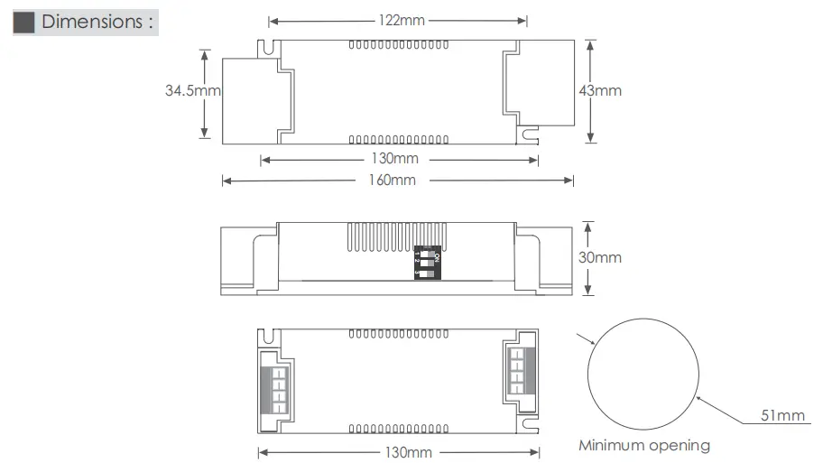 Intelligently adjusting or turning off the output current if the PCB temperature ≥110°C, , auto recovers. |