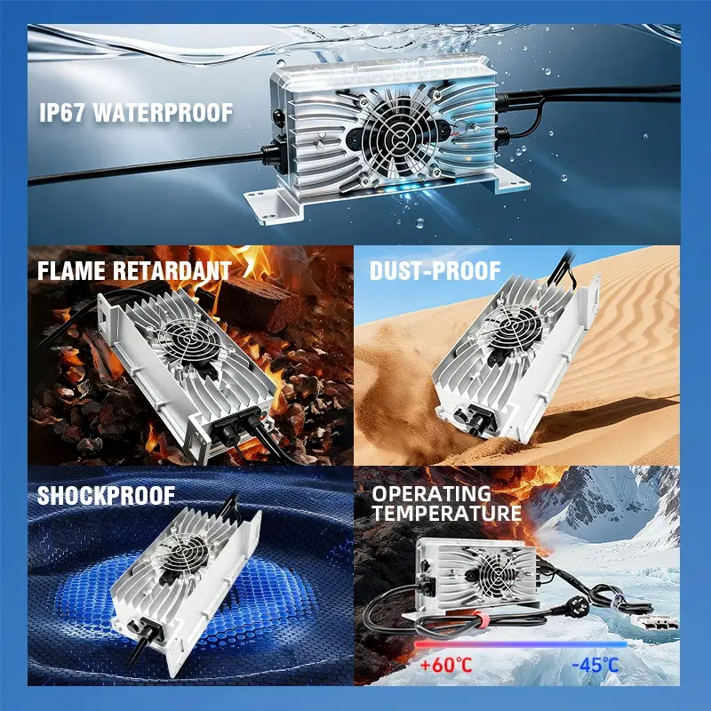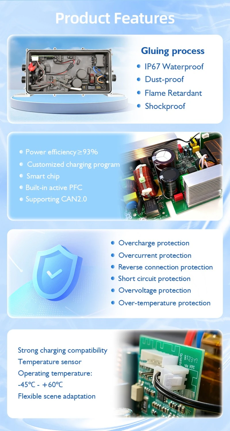 Boasting a 1.2kW rated power and 25A output current, this 1.2kW onboard battery charger can fully charge a 48V 100Ah battery in just 4 hours, which is 20% faster than ordinary 1000W chargers. The high-efficiency circuit design reduces energy loss to less than 10%, saving energy while ensuring rapid charging, making it ideal for scenarios that require quick battery replenishment.