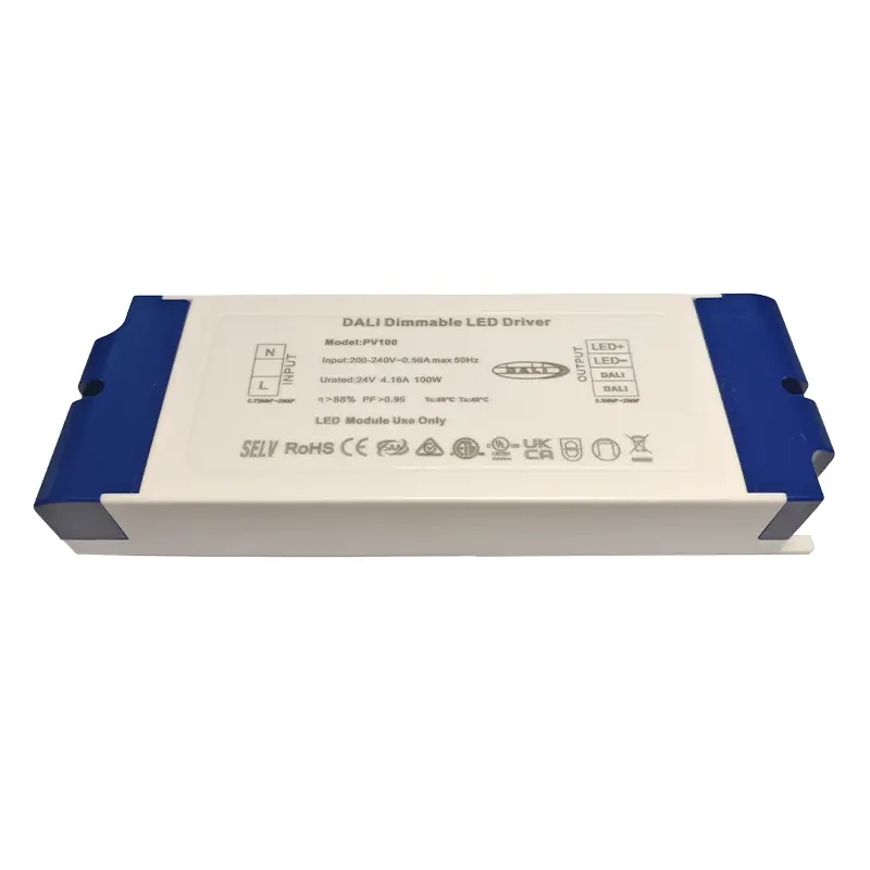 As a professional manufacturer of Constant Voltage DALI Drivers in China, Starwell can provide you with a high-quality 100W Constant Voltage DALI Driver for 24V dimmable applications, which offers a stable 24V/4.16A DC output with an efficiency of up to 90%. It supports smooth, flicker-free dimming from 100% to 0.1% and features comprehensive short-circuit, over-voltage, overload, and over-temperature protection functions.