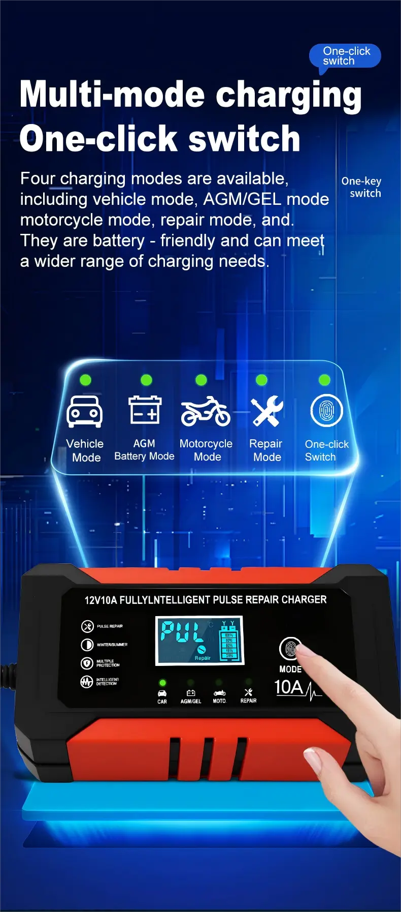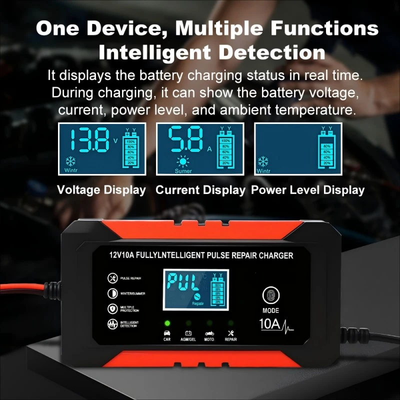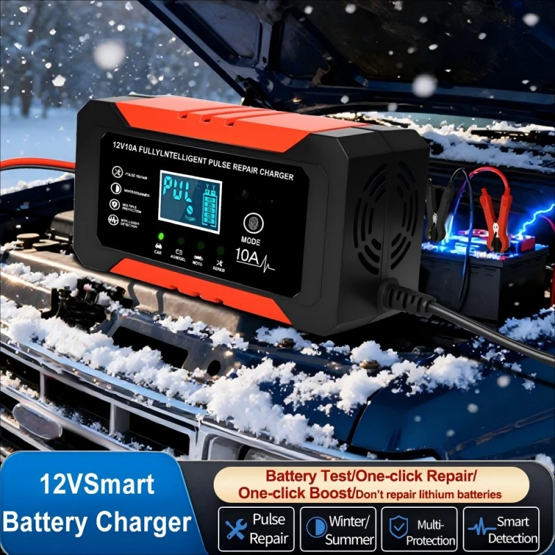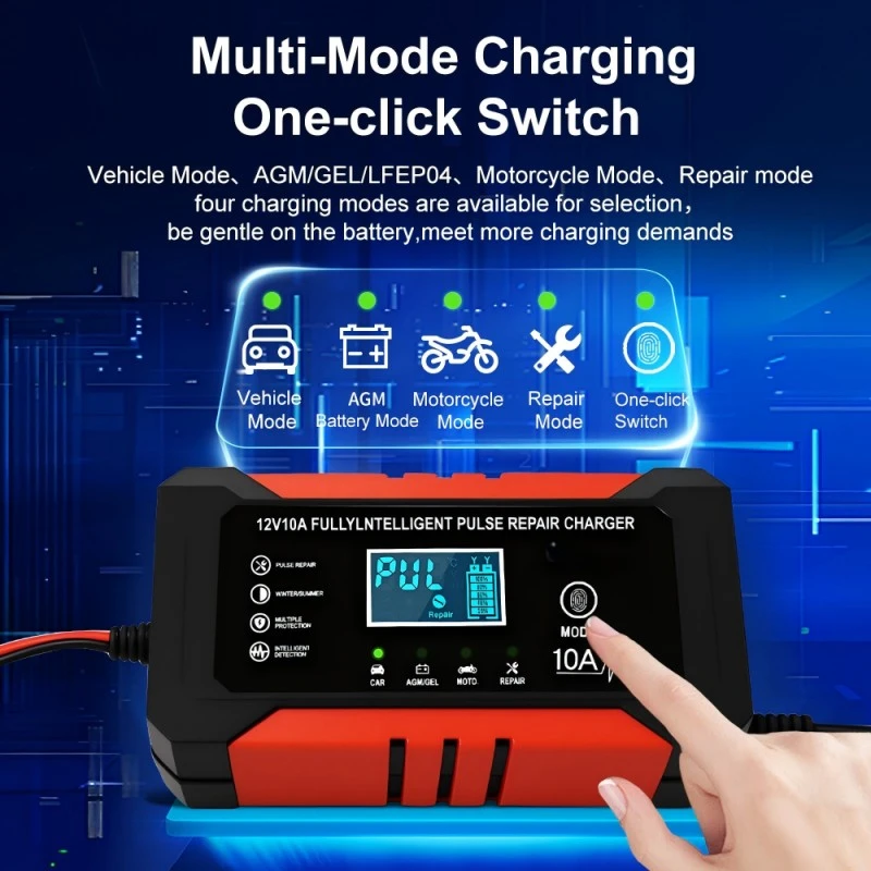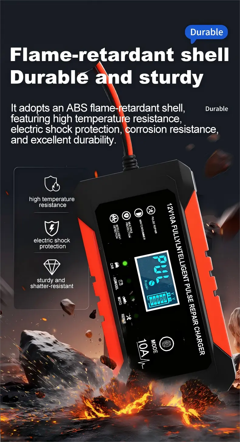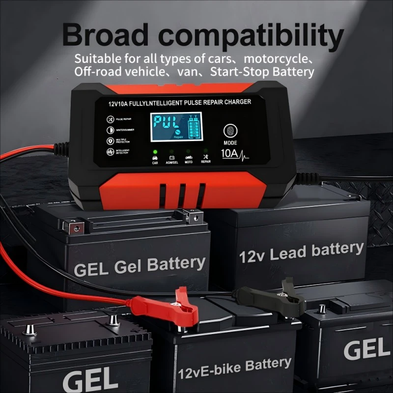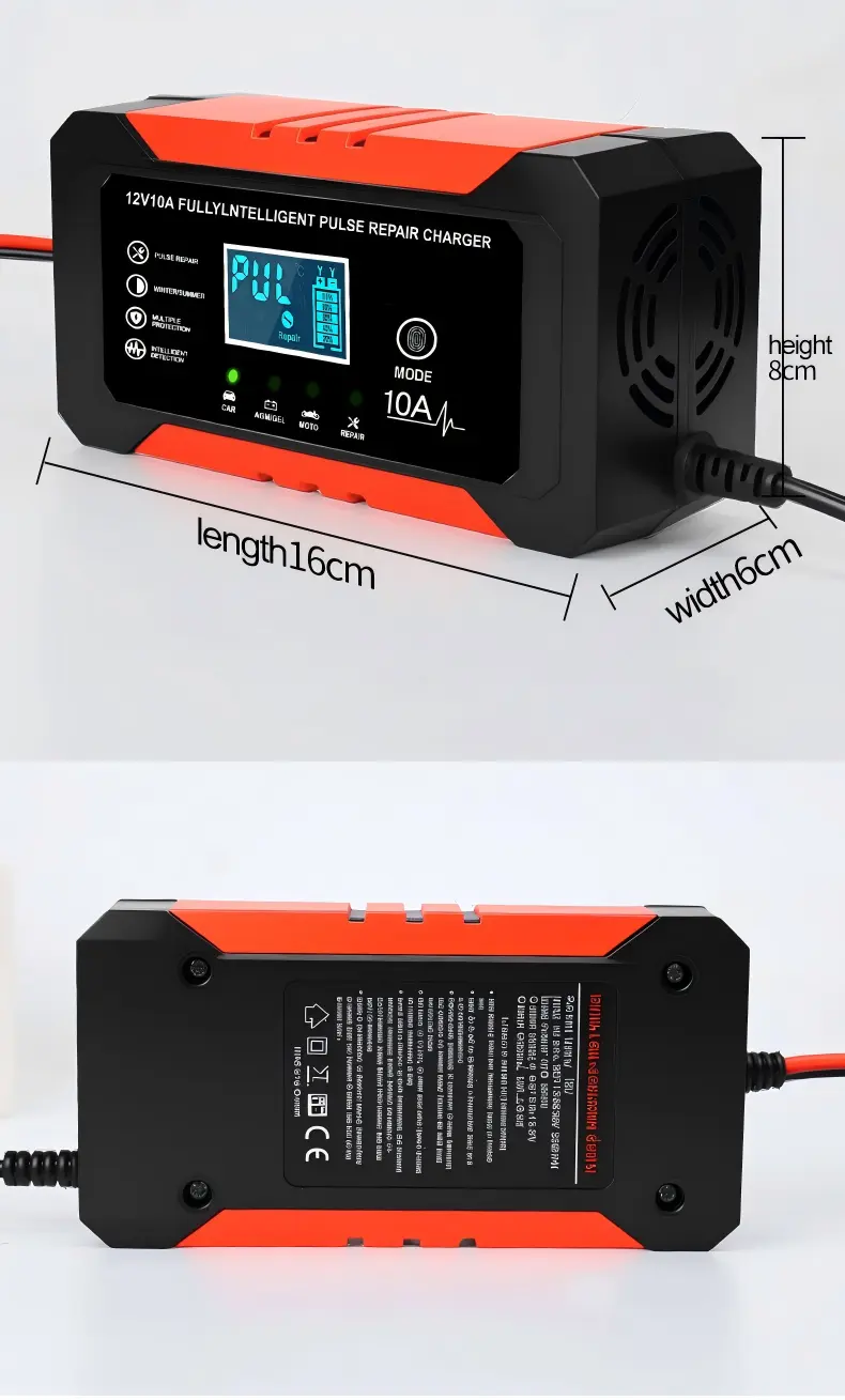 Equipped with precise technical specifications, this intelligent battery charger features a universal input voltage range of 110~230V AC (50/60Hz), ensuring compatibility with power grids worldwide. It provides a stable 12V DC output with a 10A charging current, delivering consistent power to quickly recharge batteries—capable of fully charging a 100Ah lead-acid battery in approximately 10 hours, significantly faster than standard 5A chargers. With an energy efficiency of over 95%, it minimizes energy waste, while its compact aluminum housing (170×90×50mm, 1.0kg) ensures portability and durability.