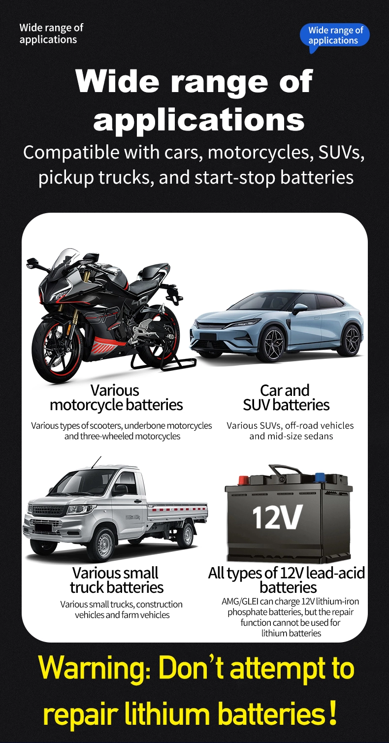 1. Universal Compatibility & Multi-Battery Support: It works seamlessly with all 12V battery types, including lead-acid, AGM, Gel, and LiFePO4, covering battery capacities from 6Ah to 180Ah. The 110~230V wide input range eliminates regional limitations, making it usable in over 100 countries and regions around the world.