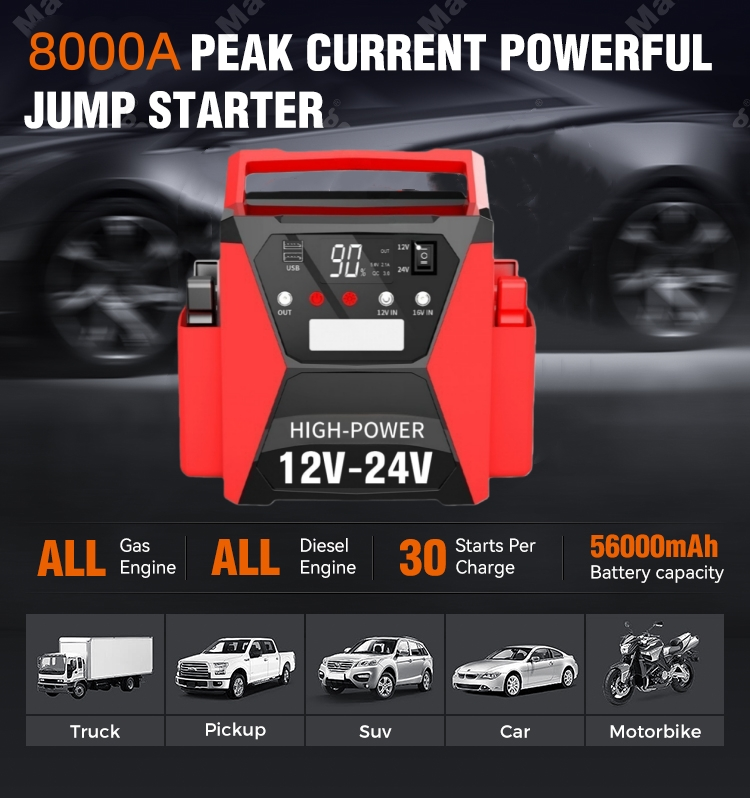 STARWELL introduces its high-performance 12V/24V Car Jump Starter Intelligent Battery Charger, a game-changer for vehicle owners seeking reliability and intelligence in battery maintenance and emergency starting. Equipped with an 8000A peak current and 4000A start current, this dual-voltage intelligent battery charger combines robust power with smart technology, making it suitable for all gas engines and diesel engines up to 15L, covering cars, trucks, RVs, motorcycles, boats, and even heavy-duty commercial vehicles.