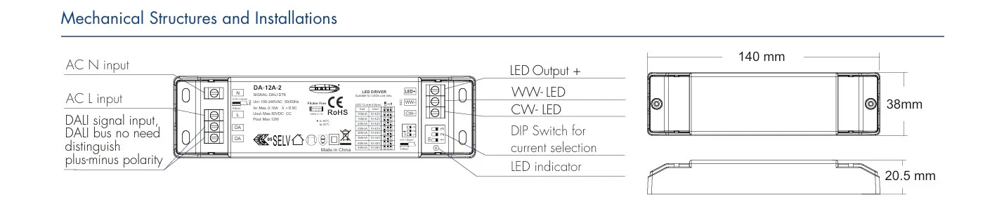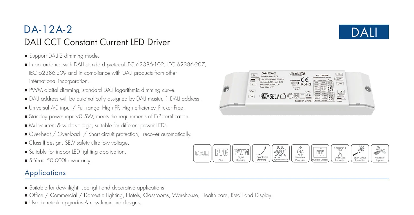 Housed in a compact IP20 case, this Dimmable LED Driver simplifies installation even in confined spaces such as LED profiles or fixture housings. By combining Constant Current output, broad CCT tuning, and industry-standard DALI-2 compatibility, it serves as an ideal and future-proof driver for tunable-white downlights, linear fixtures, and architectural lighting—seamlessly integrating into modern smart lighting ecosystems as a versatile Constant Current DALI CCT Dimmable LED Driver.