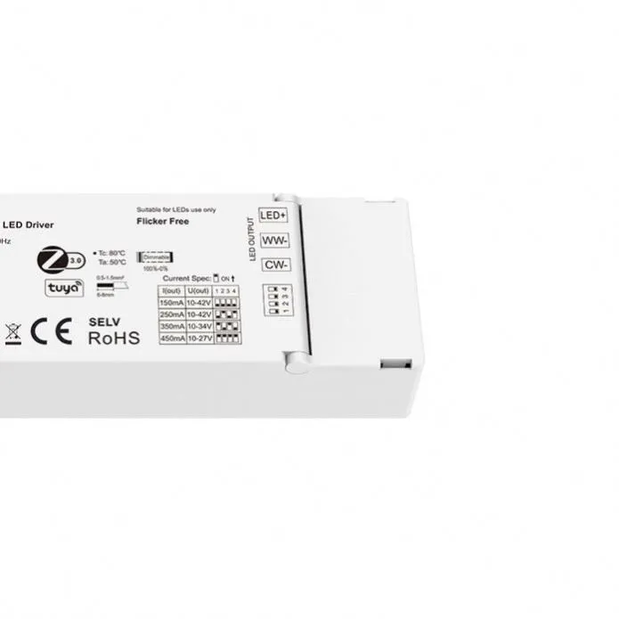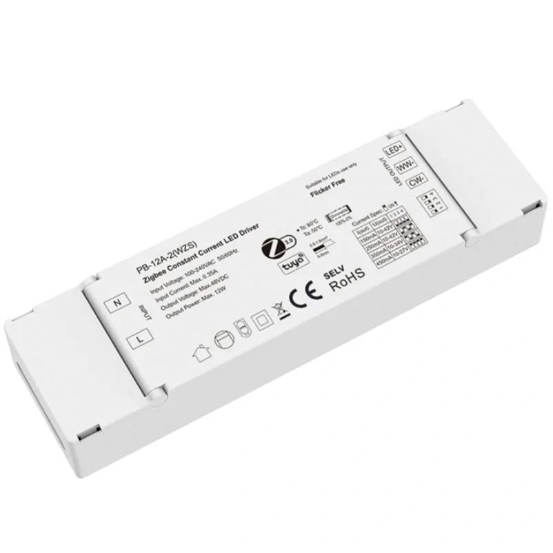 STARWELL factory’s CE-certified 12W TUYA Zigbee CCT Dimmable LED Drivers are high-efficiency smart lighting power solution designed for modern residential and commercial lighting systems. It supports a wide input voltage of 100~240VAC 50/60Hz, enabling stable global application. With a rated output power of max.12W, this driver realizes smooth CCT dimming control based on the TUYA Zigbee wireless protocol, allowing users to adjust both brightness and color temperature remotely via APP, voice assistants, and smart scenes.