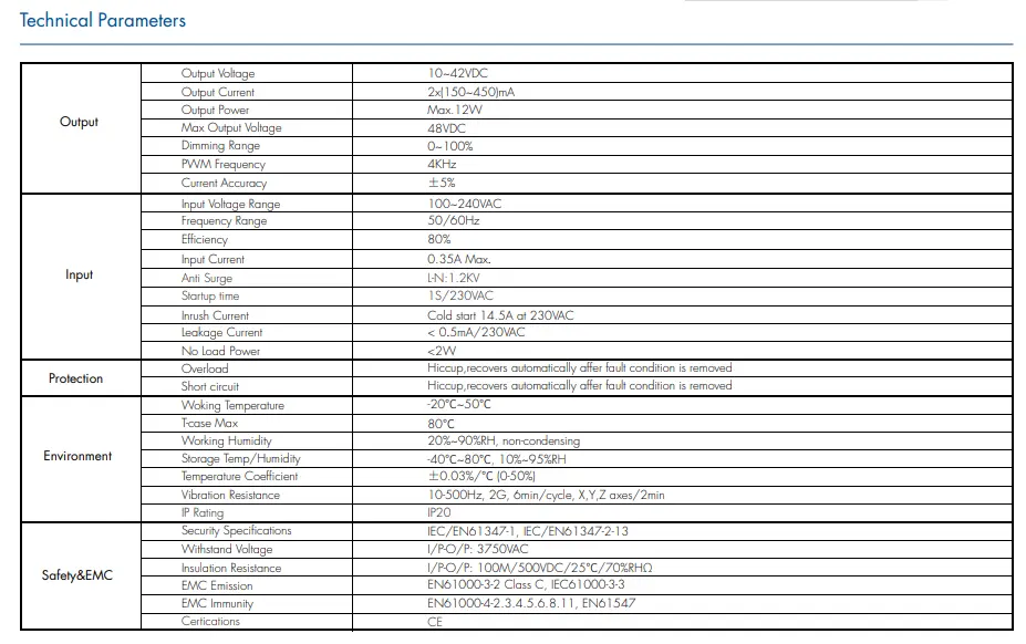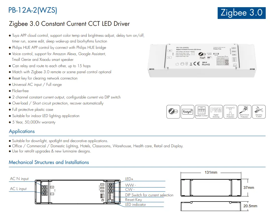 The 12W TUYA Zigbee CCT Dimmable LED Drivers feature high conversion efficiency up to 85%, power factor ≥0.90, and low no-load power consumption, effectively reducing energy waste. Built-in full protections including over-voltage, over-current, short-circuit and over-temperature ensure safe and stable operation. Adopting a compact and fire-resistant enclosure, it is widely used in smart home, hotel, office and retail tunable white lighting systems, providing reliable and user-friendly intelligent dimming performance.