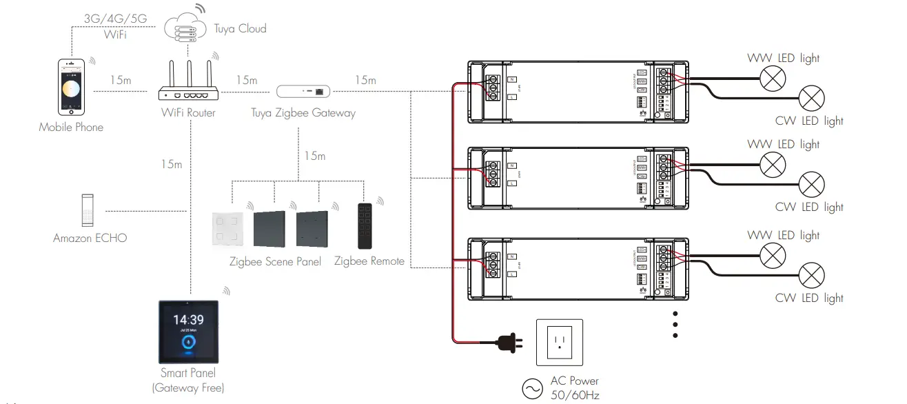 The TUYA Zigbee LED Driver fully supports the TUYA Zigbee protocol for stable wireless connection, achieving smooth flicker-free CCT and brightness dimming. It supports APP control, voice control, group control and scene mode, bringing great convenience to smart lighting systems.