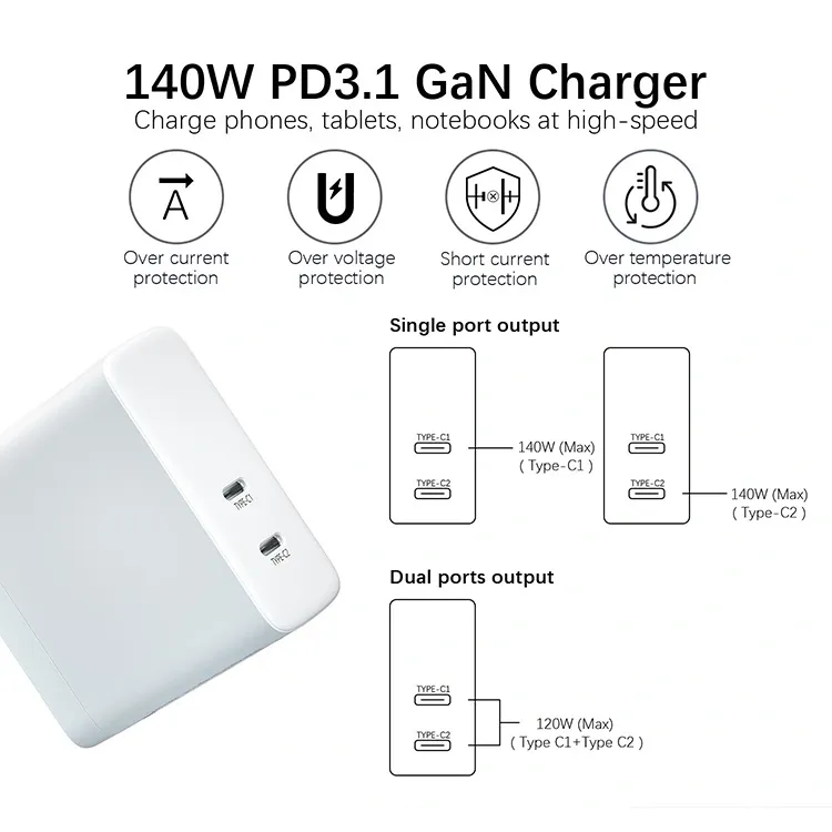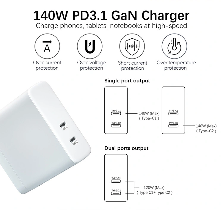 140W dual-port fast charging: The single port can provide up to 140W power. The dual ports output power is intelligently allocated simultaneously. When charging a laptop and a mobile phone at the same time, the efficiency remains unchanged.