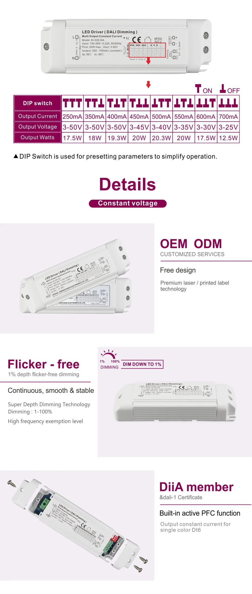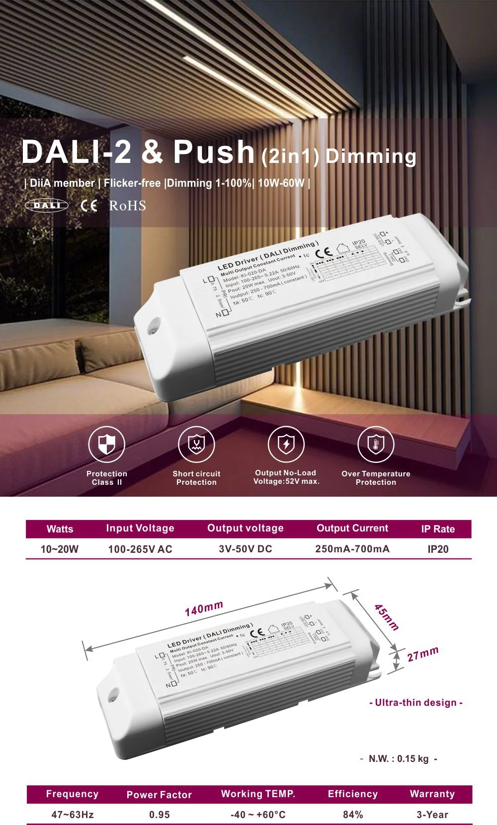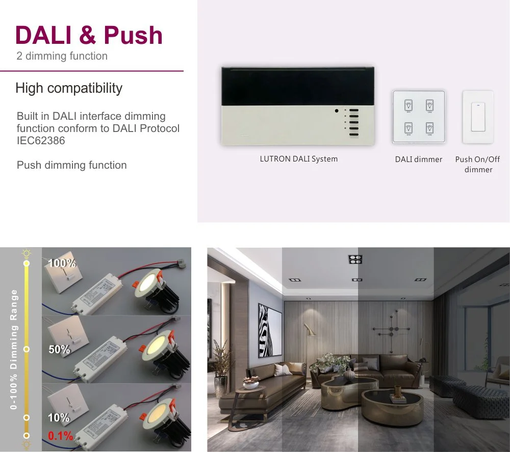 20W 350mA Constant Current Dali Push Dimming Led Driver, this driver supports the innovative Dali Push dimming 350mA constant current 20W led driver operation mode, allowing users to manually adjust the light through simple buttons, greatly enhancing the flexibility of installation, commissioning and daily use. At the same time, 20W Dali dimming LED Driver Constant Current 1000mA 89% Efficiency for led lighting, with its conversion efficiency as high as 89%, significantly reduces energy consumption and heat loss, making it suitable for lighting scenarios with higher requirements for power and heat dissipation.
