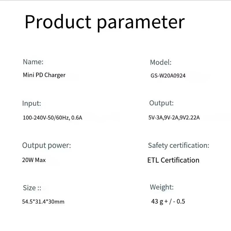 20W Japan version plug PD Charger Specification: