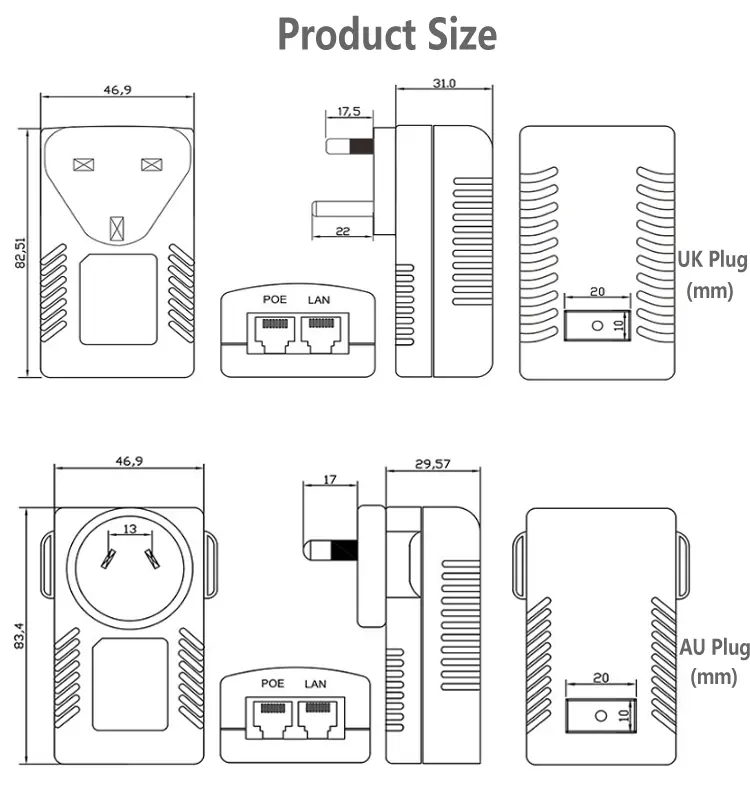 Compact wall-plug structure allows direct use with standard power sockets, requiring no extra brackets or wiring. This 24V 1A 48V 0.5A POE injector saves space and simplifies cabling, making it an ideal choice for home, office, shop and small surveillance systems.