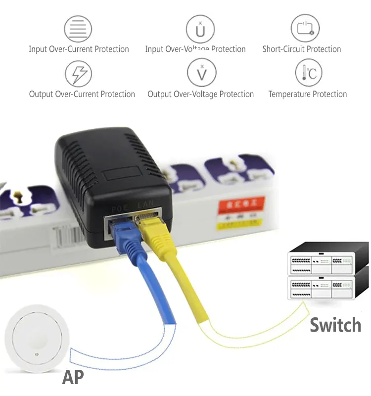 The 2 Port POE Injector delivers stable voltage and current with low ripple, ensuring long-term stable operation. Wide input voltage 100–240VAC adapts to global power grids. Built-in over-voltage, over-current, short-circuit and over-temperature protection safeguard both the dual port POE injector and connected equipment.