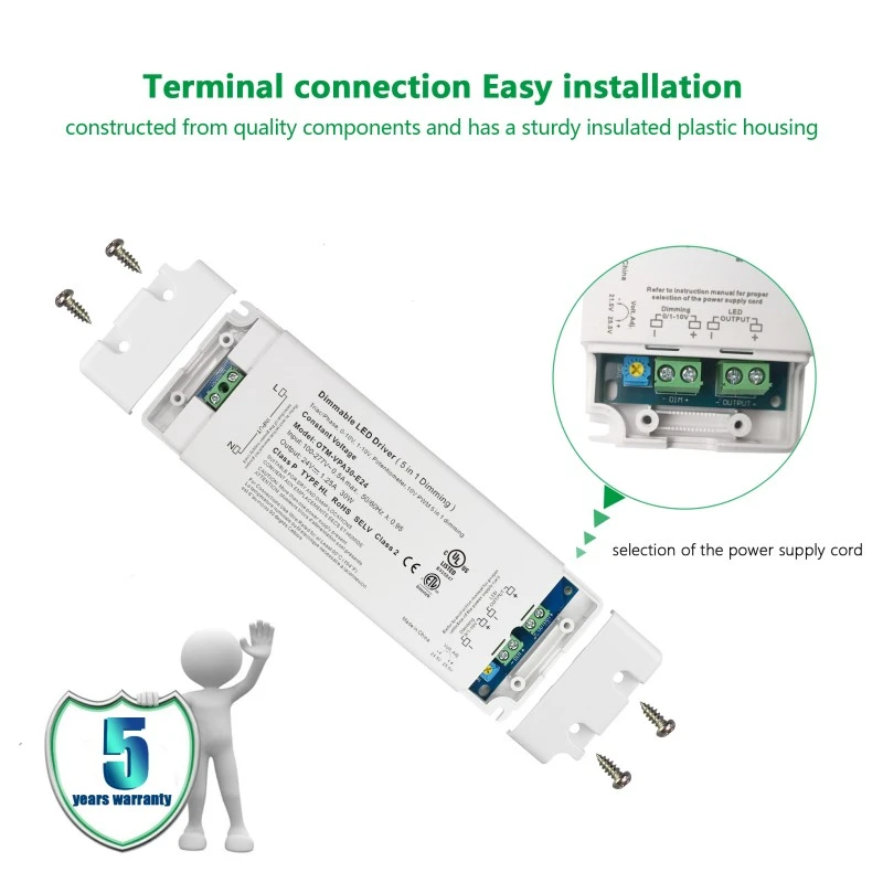 2. Stable Constant Voltage Output: The 0-10V constant voltage LED driver provides a 24V fixed output voltage with a voltage regulation rate of ± 2% and a ripple of ≤ 120mVp-p, which guarantees consistent LED performance.