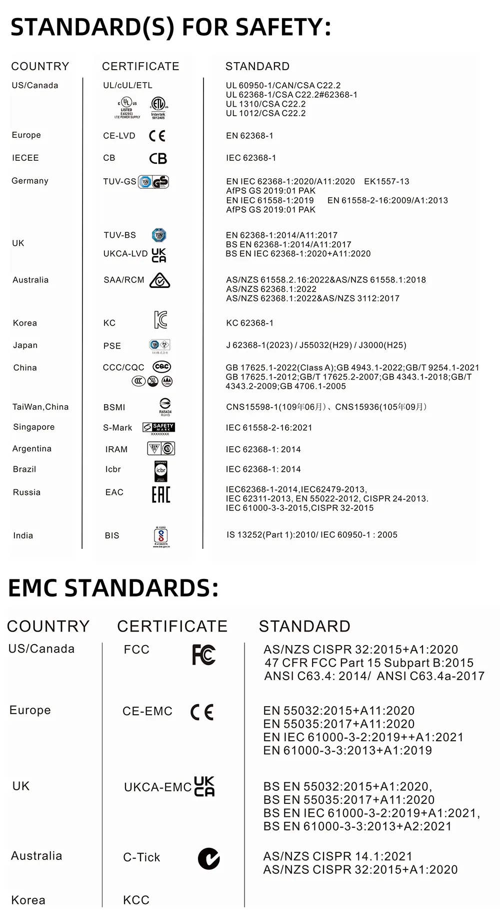 ETL CE FCC TUV GS CB PSE KC KCC BIS SAA RCM c-Tick CCC UKCA UL cUL RoHS |