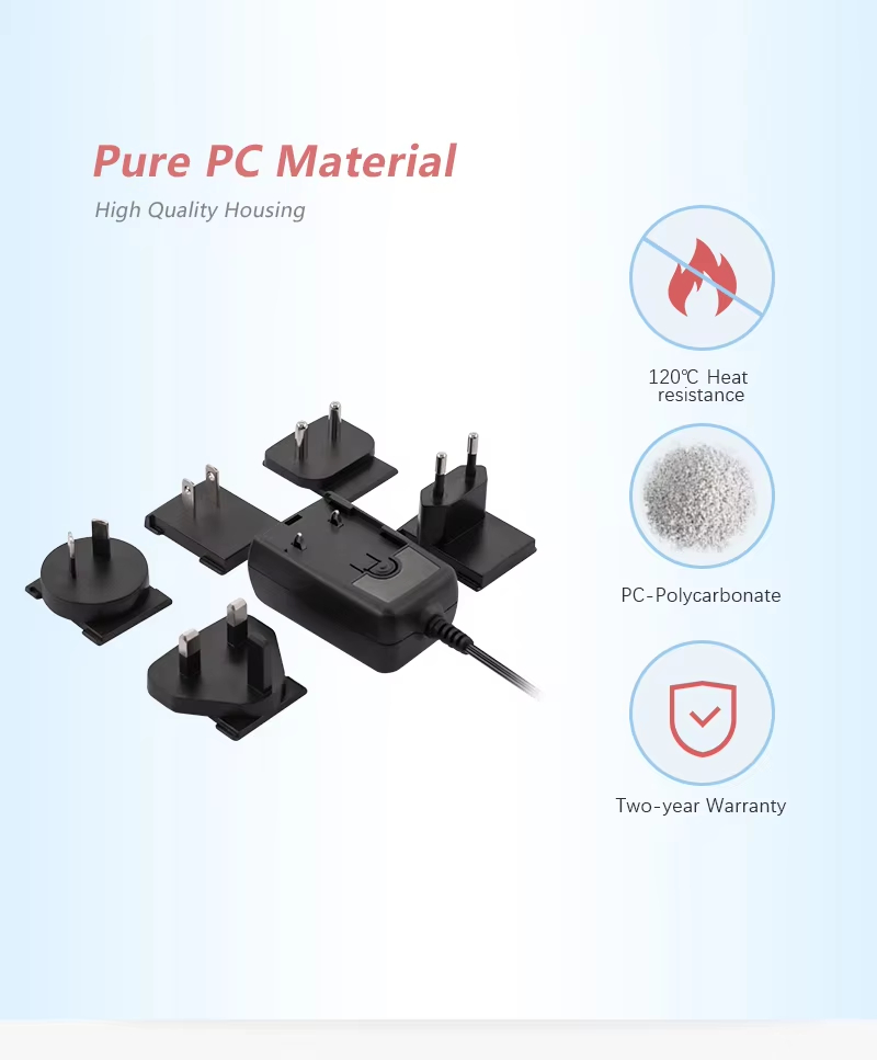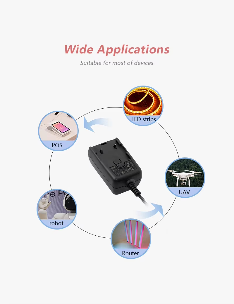 Efficient and stable power supply: As a high-performance 24W power adapter, it adopts advanced Switching interchangeable plug power supply technology to achieve efficient conversion. It can stably convert alternating current to direct current (AC to DC interchangeable plug power adapter), providing continuous and pure energy for your devices.