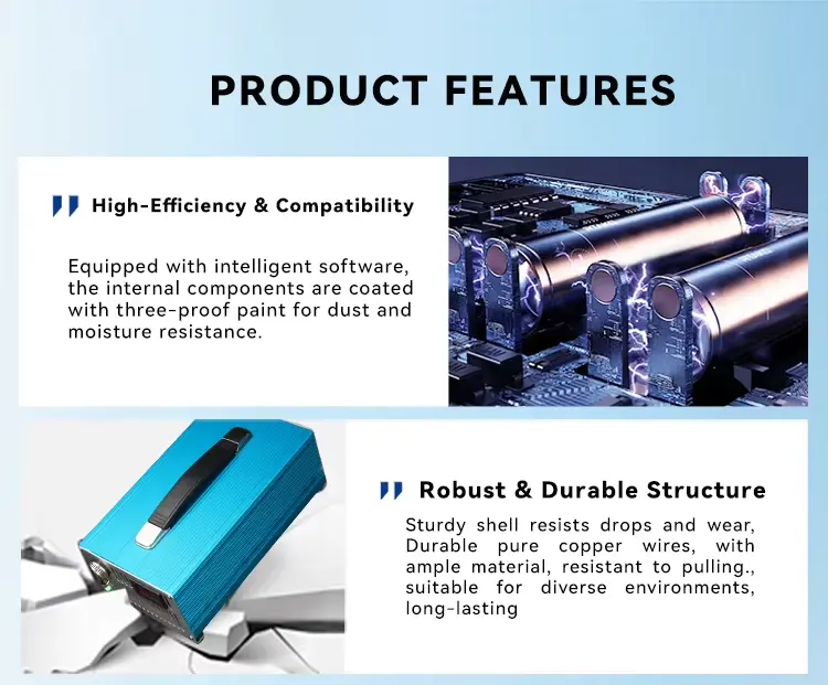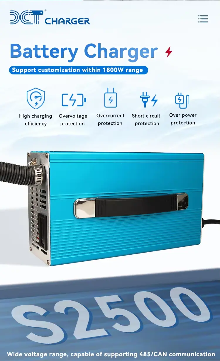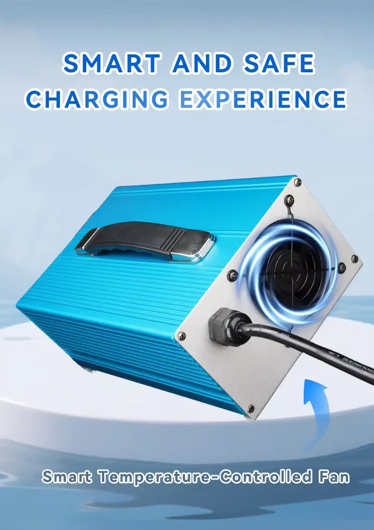 It uses an intelligent four-stage charging logic: pre-charge, constant current, constant voltage, and float charge, which effectively extends battery life while ensuring full charging. Built-in full protection mechanisms include over-voltage, over-current, over-temperature, short-circuit, and reverse-polarity protection, enhancing operational safety and reliability. The charger supports automatic power-off upon full charge, freeing users from manual monitoring.