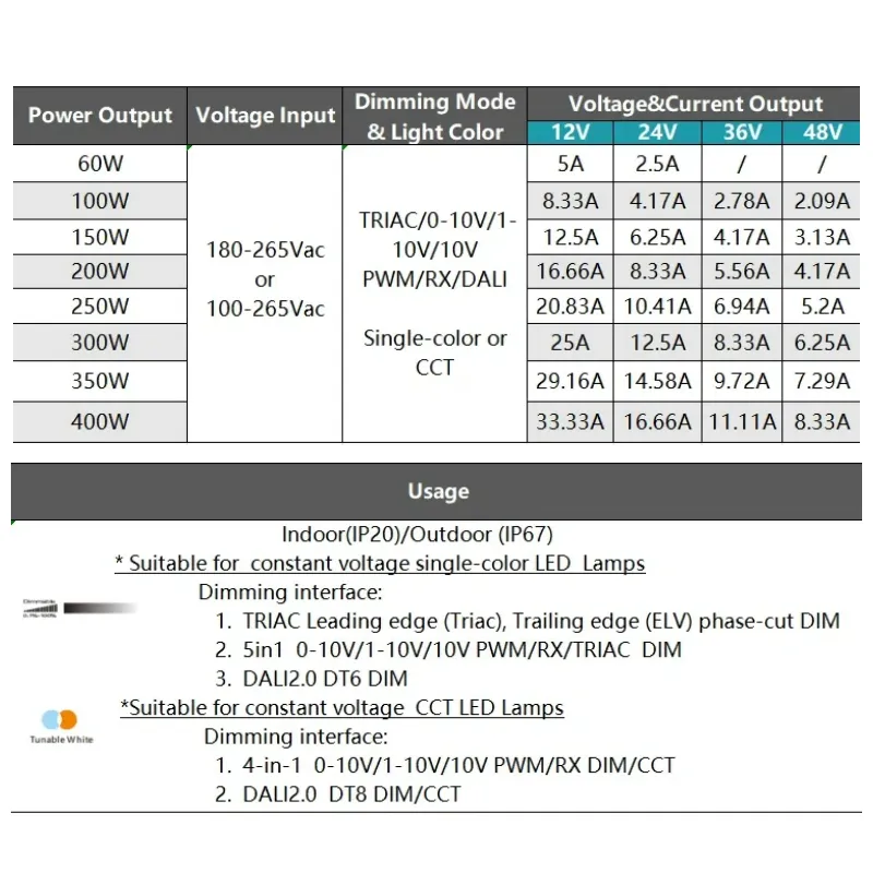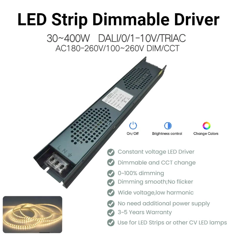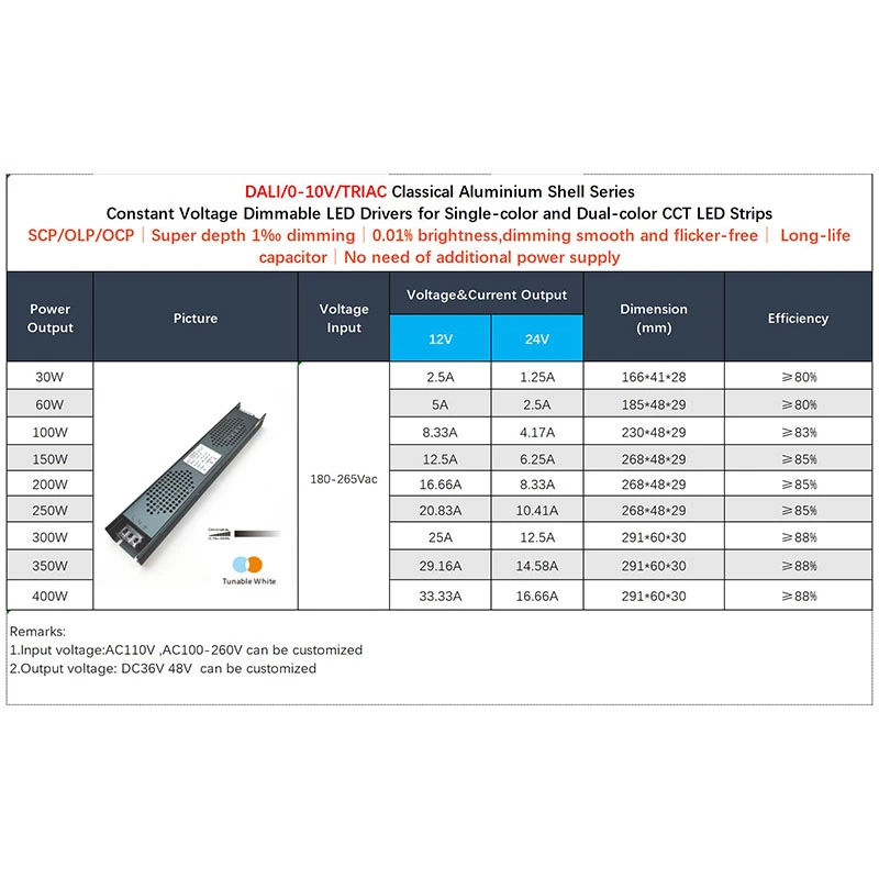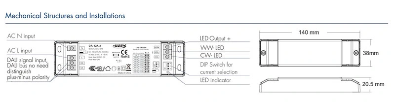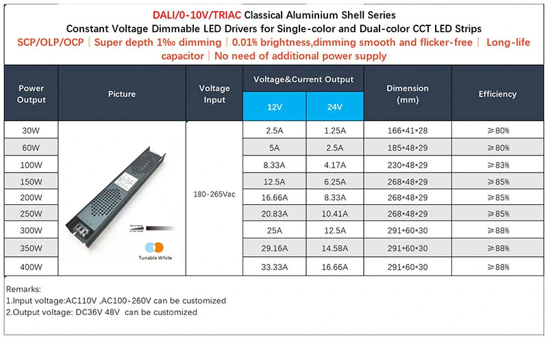 This constant voltage DALI CCT dimmable LED driver delivers 12/24VDC output with ±1% voltage tolerance and 2.5A max current, equipped with 4 auto-recovering safety protections and stable operation in -20℃ to +45℃. With IP20 rating, CE/TUV/RoHS certification and 190,900-hour MTBF, this constant voltage DALI CCT dimmable LED driver ensures durable and safe performance in various indoor lighting scenarios.