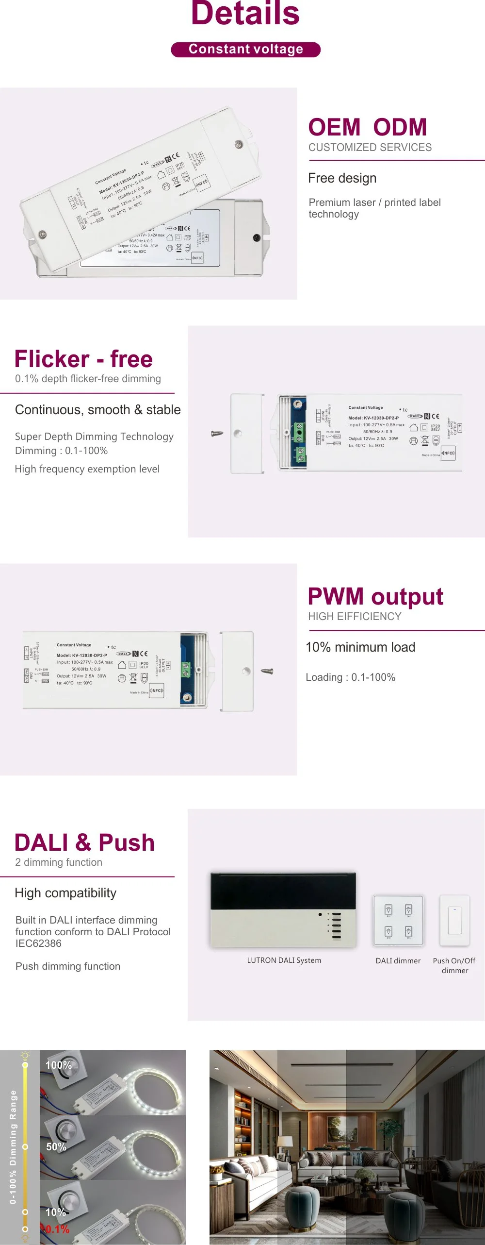 ·Dimming range: 0-100%, LED start at 0.1% possible