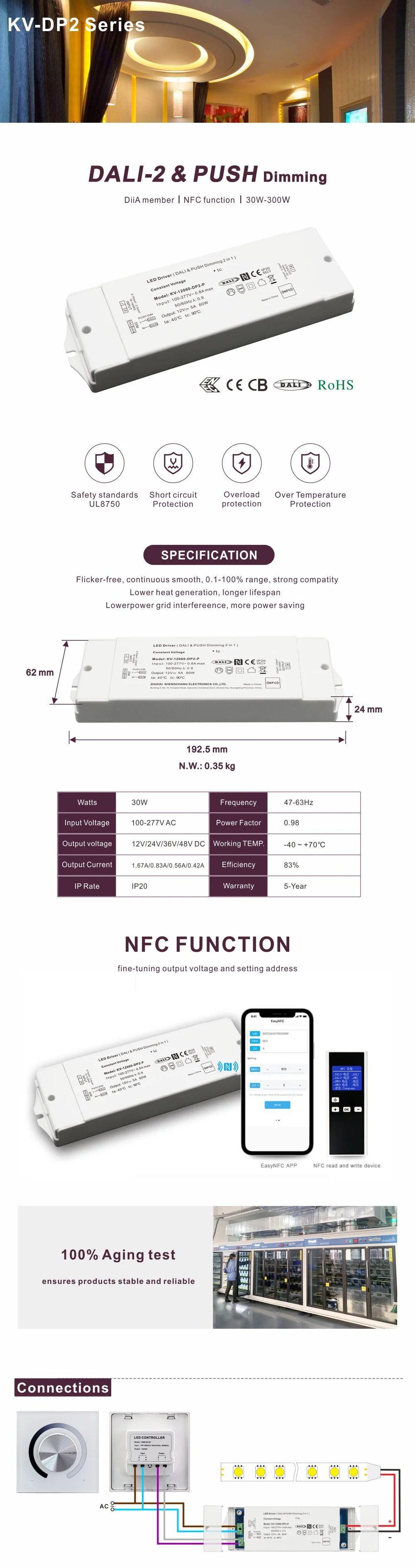 In addition to its powerful DALI functionality, this driver offers an outstanding dimming experience. It achieves a silky smooth NFC Dimming Smooth No Flicker effect, completely eliminating visible flickering and jittering even at low brightness levels, effectively protecting eyesight and creating a comfortable and healthy lighting environment. Its wide AC input voltage range (100-265V input) design enables it to adapt to voltage fluctuations in power grids worldwide, ensuring stable operation in different regions.