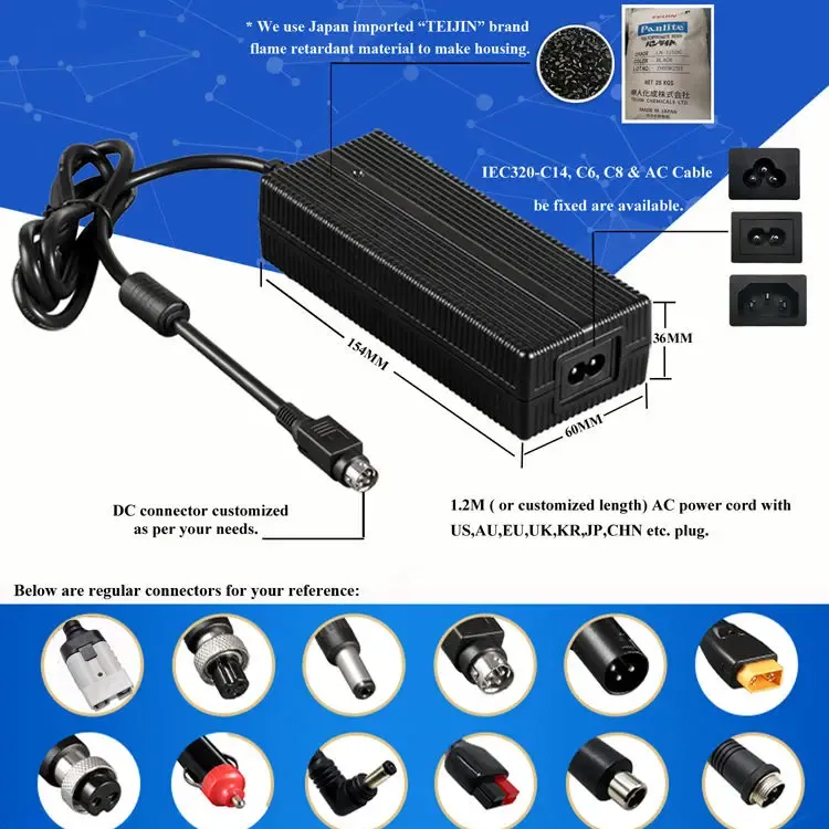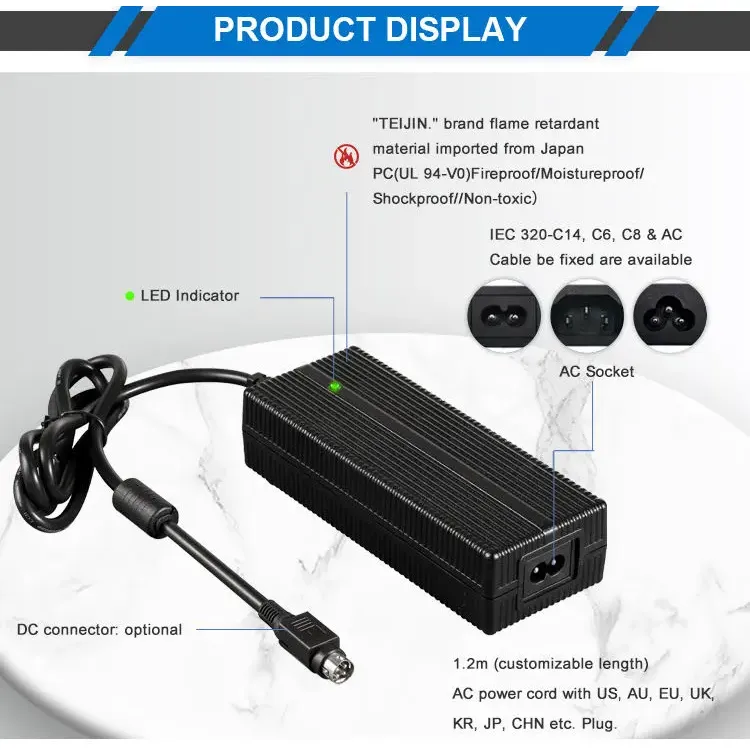 Global Compatibility & Flexible Design: Built with a universal AC input range of 100–240VAC, 50/60Hz, this charger supports worldwide use. It offers multiple AC inlet options (IEC320-C14, C6, C8) and comes with a 1.2M power cord that can be customized with US, AU, EU, UK, KR, JP, CHN, and other regional plugs. The housing is constructed from PC fireproof material, ensuring durability and safety under various operating conditions.
