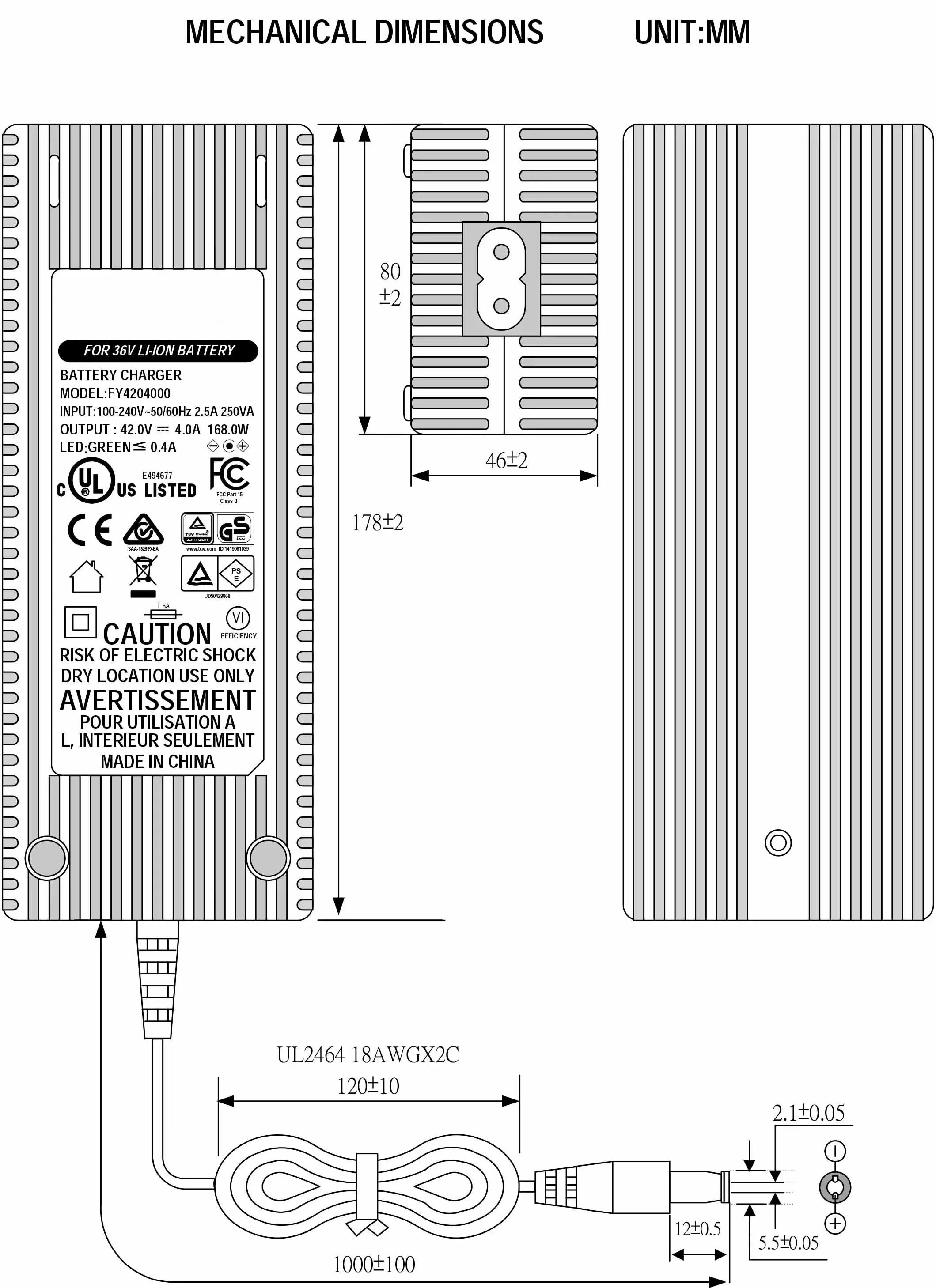 Comprehensive Protection & Certifications: Safety is paramount. The 42V 4A Scooter Battery Charger features robust protection mechanisms including short circuit, overvoltage, overtemperature, and overload protection, with HIPOT testing up to 4200V for added insulation safety. It operates efficiently at >89% efficiency and carries an extensive list of global certifications: UL, CUL, GS, CE, BS, SAA, KC, PSE, CB, FCC, EMC, ROHS, and REACH, complying with safety standards such as UL60950, IEC60950, and IEC60335.