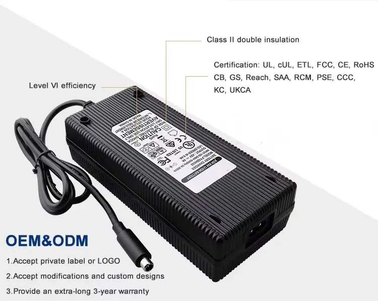 Q5: What certifications you have ? A: Our company have been certified by ISO 9001:2015.ISO 14000:2015,QC 080000:2015;Our Battery Chargers ,Power Adapters and LED Power Supplies are passed UL, FCC, CUL, CE, RoHs, CB, TUV, GS, SAA, RCM, PSE, KC, CCC. Q6: What‘s the lead time? A: Sample :3-5 days. Mass production: 15-20 days, depends on the order quantity. Q7: How do you ship the goods and how long does it take? A:We usually ship by DHL, UPS, FEDEX, TNT etc. It usually takes 4-5 days to arrive. By air, by sea are also acceptable. Q8: Could you customize electric bike battery charger for us ? A: Yes, we support both OEM & ODM.