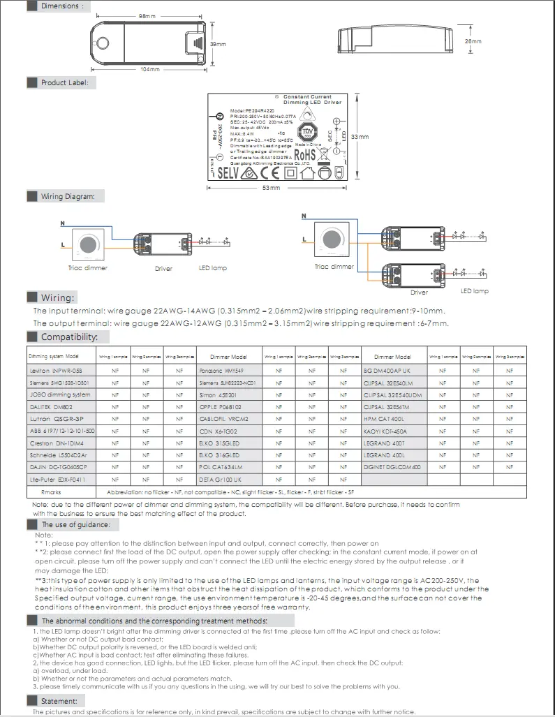 High quality PE294R 42V max 200ma constant current triac dimming led driver is one of the constont current dimming LED diver developed by China manufacturer Starwell with high power factor, high eficiency, highprecision, the use of the efficient stoble low loss switch control chip ond the high performance components mokes it with lownoiselong life and other characteristics.