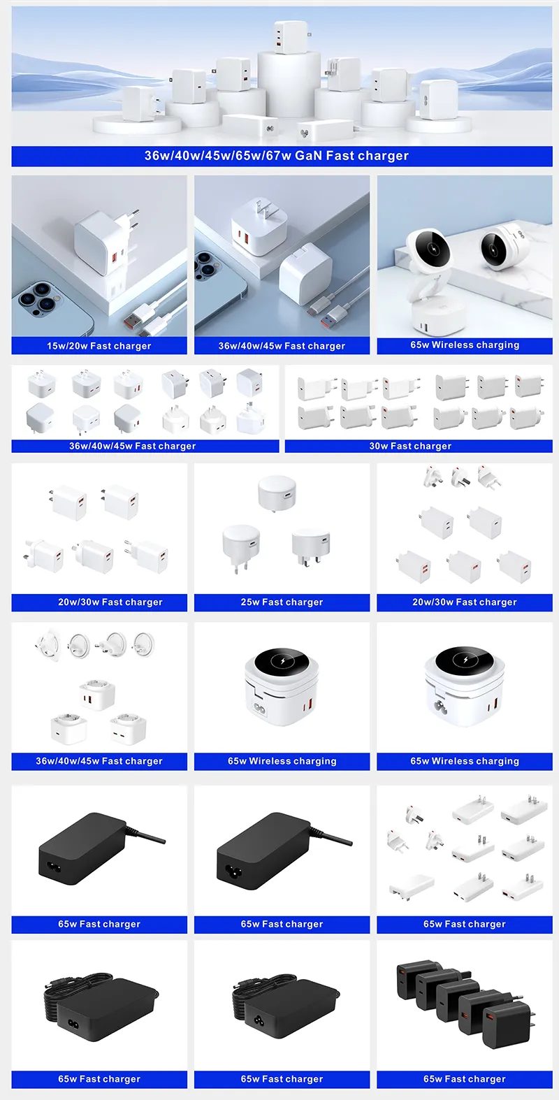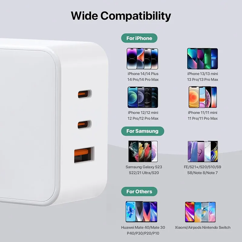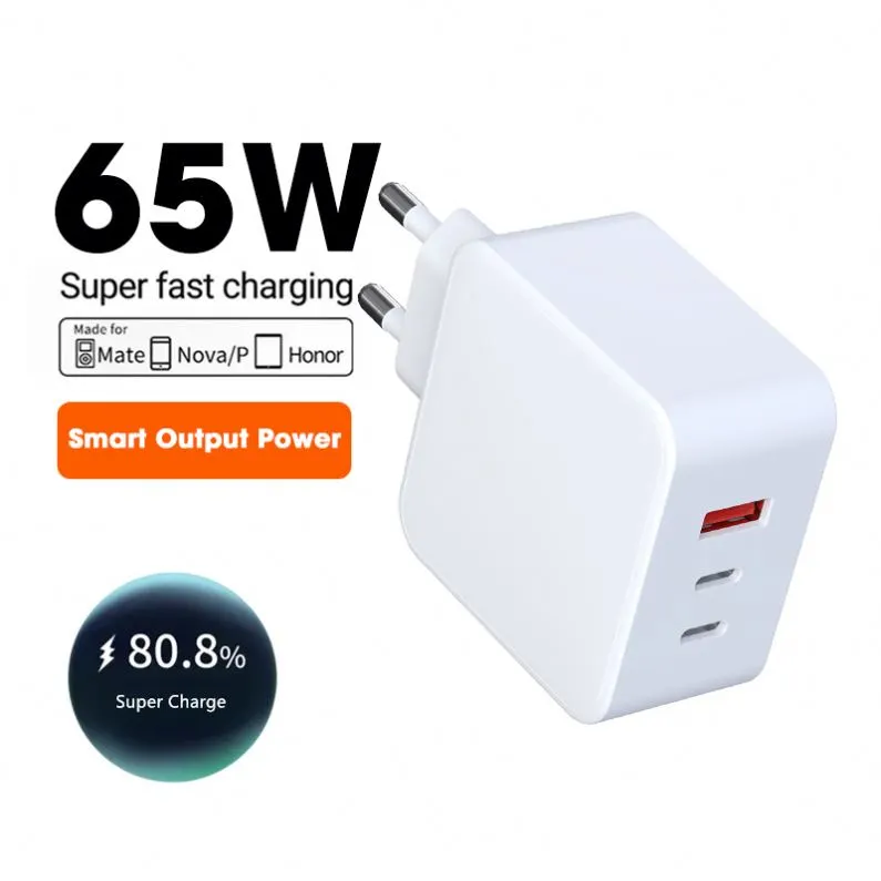 This charger delivers up to 65W of consistent power and efficiently charges laptops (e.g. MacBook Air/Pro, Dell XPS), tablets, smartphones (iPhone, Samsung Galaxy) and other devices that support PD protocol. Its compact and lightweight design makes it ideal for travel, while built-in overvoltage, overcurrent and short-circuit protection ensures safe charging of the charger and connected devices. It is usually equipped with 1-2 USB-C interfaces, which supports charging multiple small devices at the same time, balancing power and convenience.