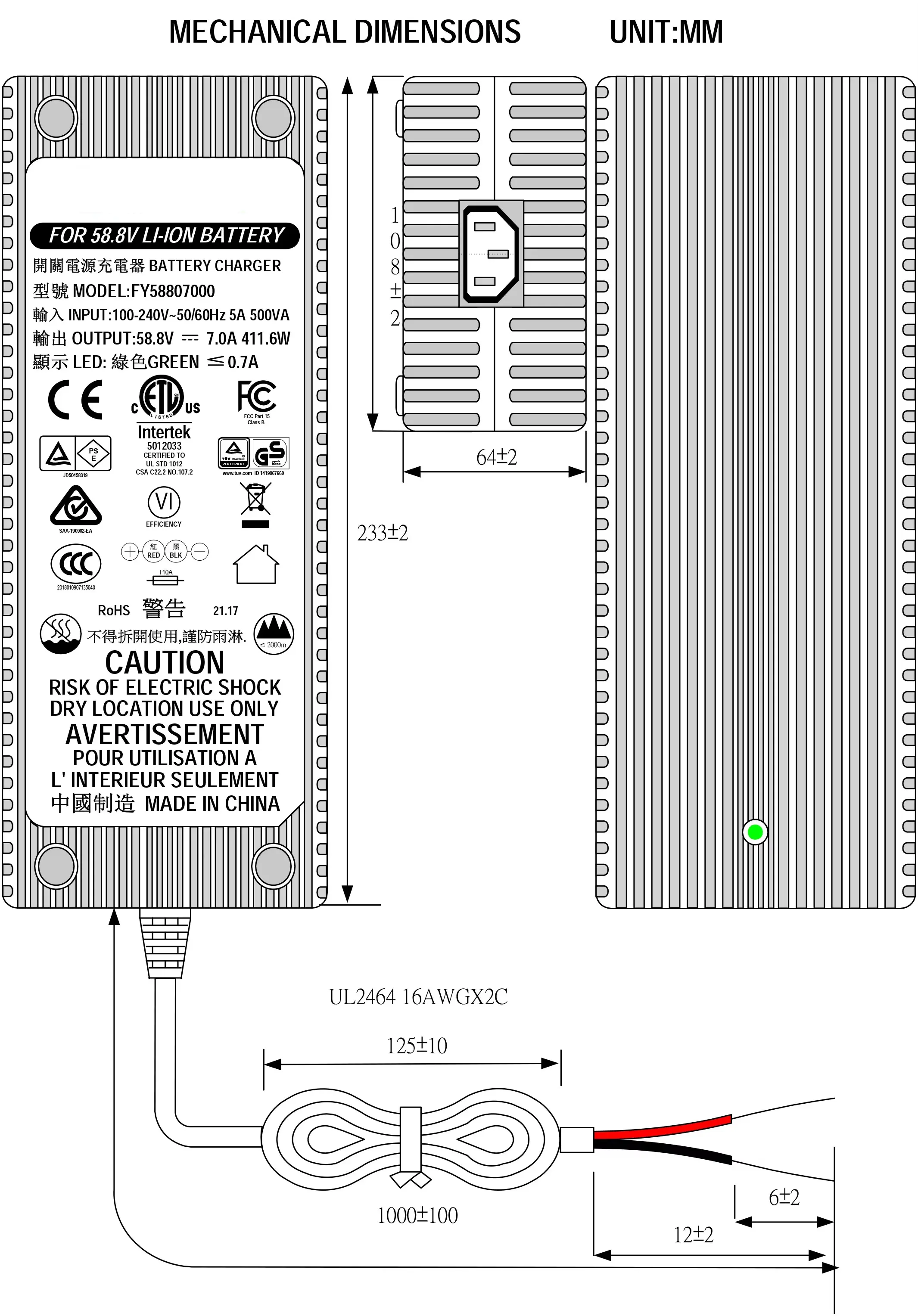 Certified to UL, ETL, CUL, GS, CE, BS, SAA ,KC, PSE, CB, FCC, EMC, RoHS, REACH standards, this charger delivers efficient, fast, and safe power for demanding electric mobility applications.
