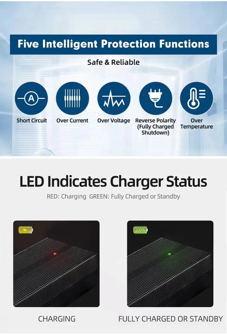 Global Compatibility & Robust Safety: Featuring a universal 100–240VAC input, it operates seamlessly worldwide. Advanced three-stage smart charging (CC/CV) optimizes battery health while comprehensive protections—including short circuit, over voltage, over temperature, and overload—ensure safe, worry-free operation. The durable housing is constructed with fireproof materials for enhanced reliability in demanding environments.