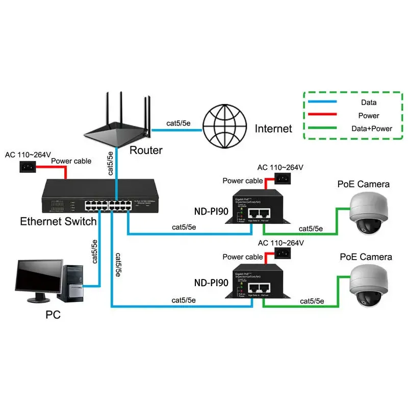 High-Speed Data Transmission Equipped with one Gigabit PoE port and one Gigabit RJ45 uplink port, this Active 48V POE injector supports 1000Mbps data transmission over Cat5e, Cat6, or higher cabling. It utilizes all four twisted pairs (1/2,3/6,4/5,7/8) for simultaneous power and data delivery, ensuring seamless connectivity and signal integrity for bandwidth-intensive applications.
