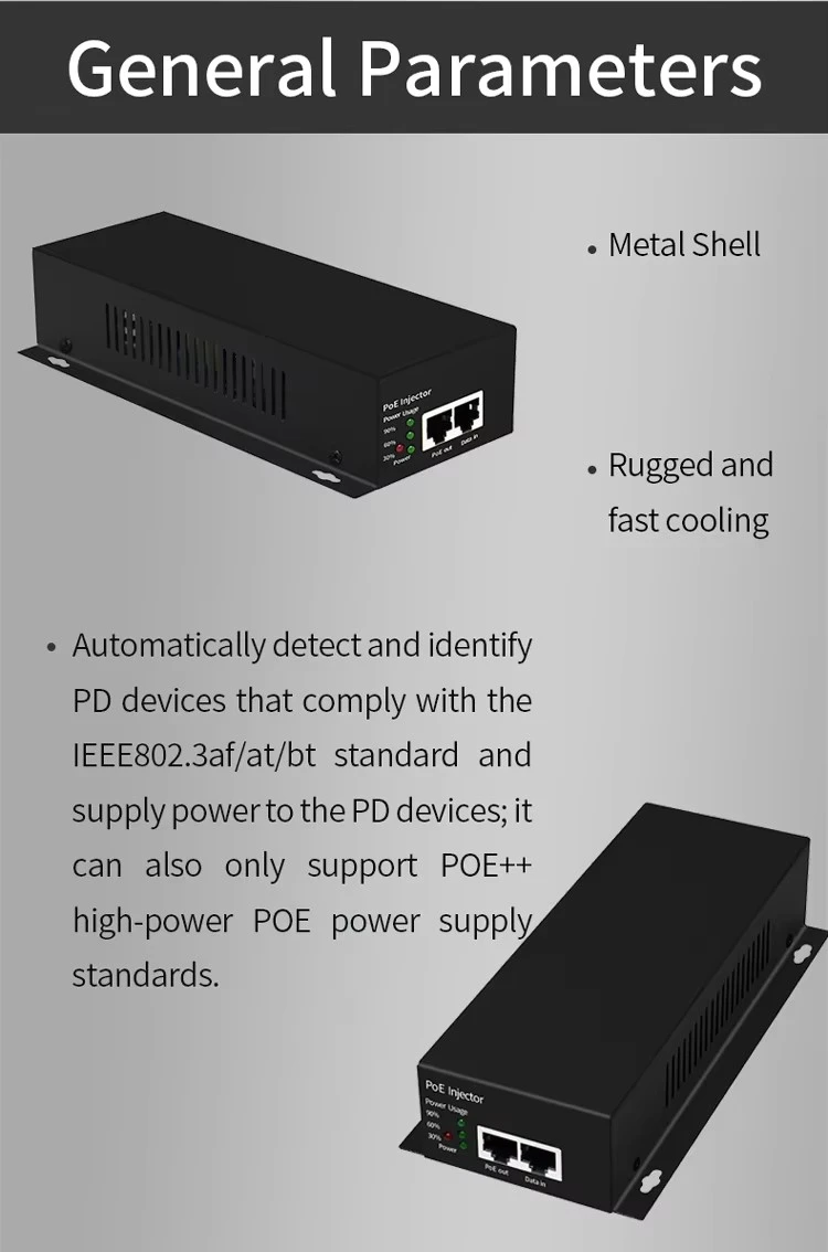 * Compliant with IEEE802.3bt standard protocol classification Class 8. * Reduce the demand for bulky power adapters and cables, and lower wiring costs. * Wide AC voltage input range of 100-240V. * Supports network bandwidth of 10/100/1000Mbps.
