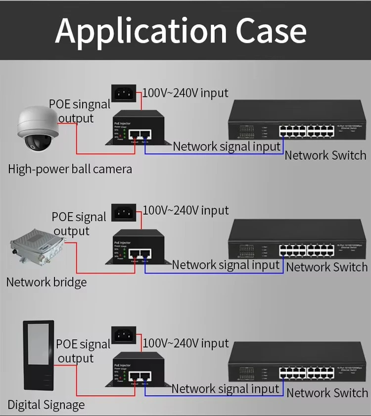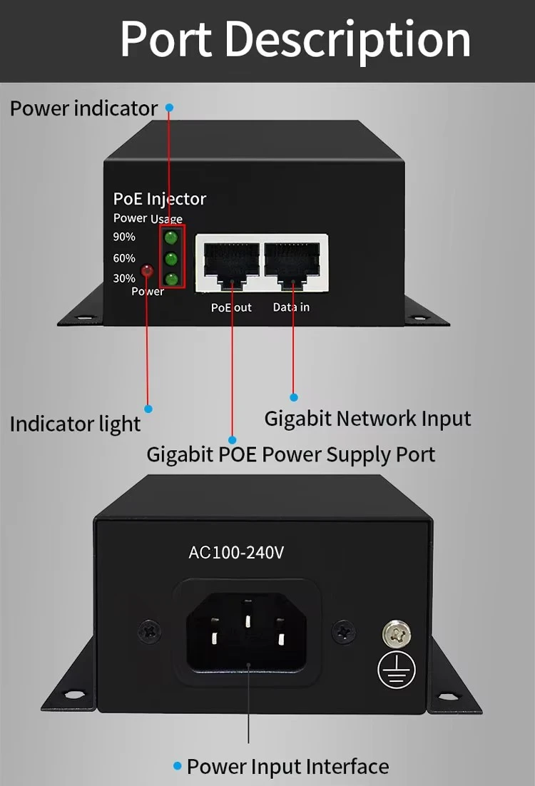 Reliable Power Performance With an input voltage range of AC100-240V and a stable DC48V1.25A output, the battery powered POE injector delivers clean and consistent 48V PoE power to connected devices. It supports the power line core configuration of 1/2,4/5(+) and 3/6,7/8(-), ensuring broad compatibility with various PoE-powered devices at the receiving end.
