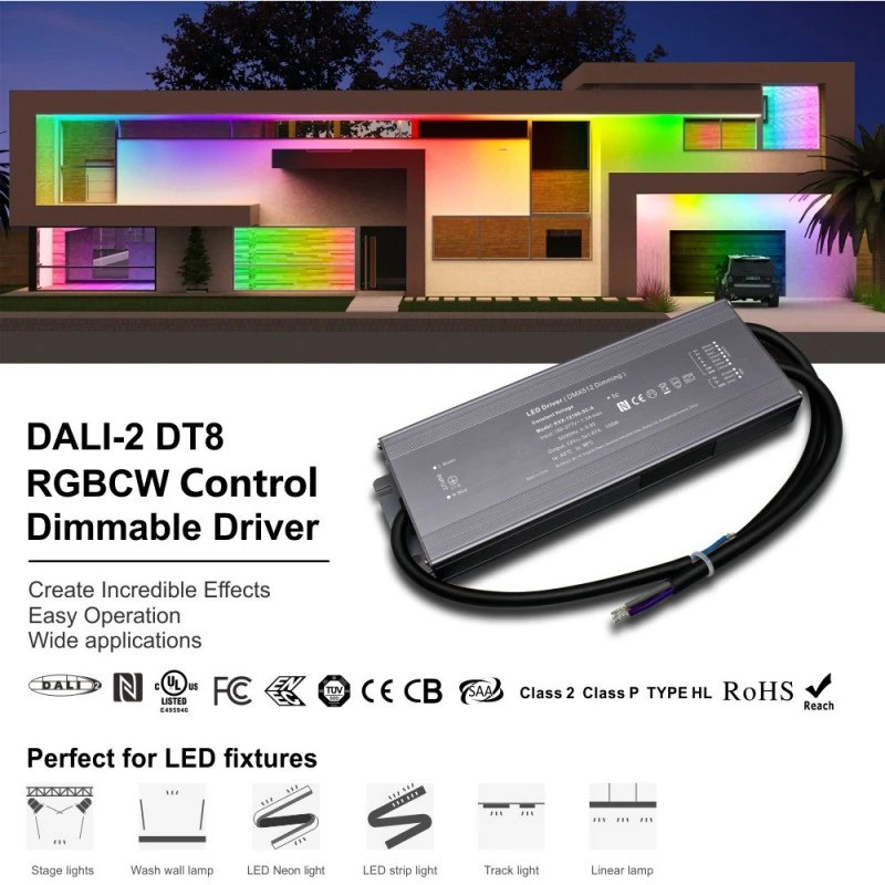 This product is a DALI Constant Voltage 200W CCT Dimmable LED Driver, representing an advanced solution for high-end commercial and smart home lighting control. As a core component fully compliant with the DALI 2 DT8 Dimmable 200W LED Driver standard, it not only enables smooth and stepless brightness adjustment but also, through the DT8 extended protocol, offers precise and digital management of color temperature (CCT) and even color (RGB) light, providing designers with unprecedented dynamic light and shadow creation capabilities.