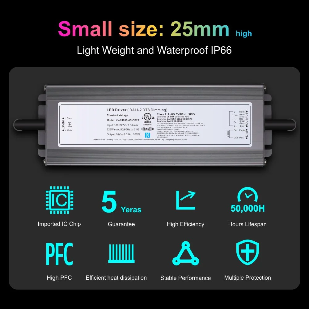 The quality and peace of mind we promise are reflected in every detail. The product has obtained UL certification, meeting strict international safety standards, and comes with a 5-year warranty for quality assurance. In a nutshell, this is not just a power supply; it is a powerful, reliable and flexible heart of lighting control. By choosing this genuine DALI 2 DT8 Dimmable 200W LED Driver, you are opting for a professional-grade smart lighting solution that is future-oriented.