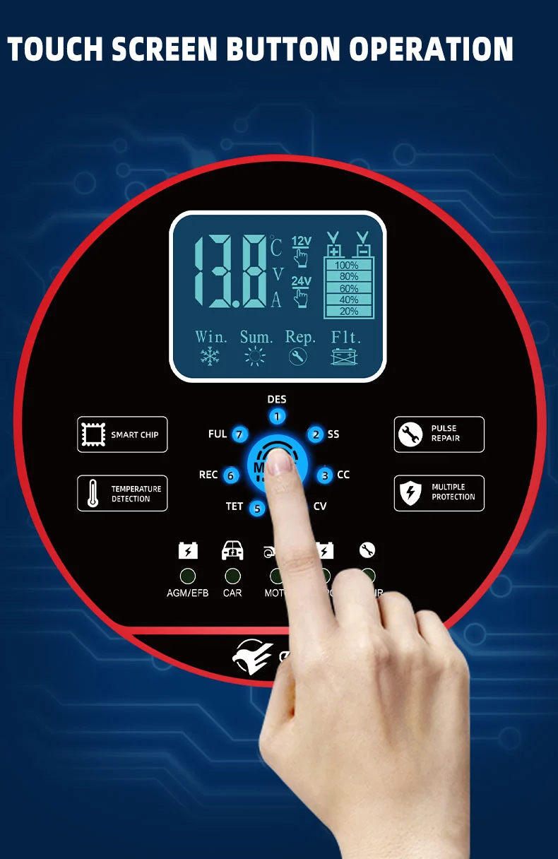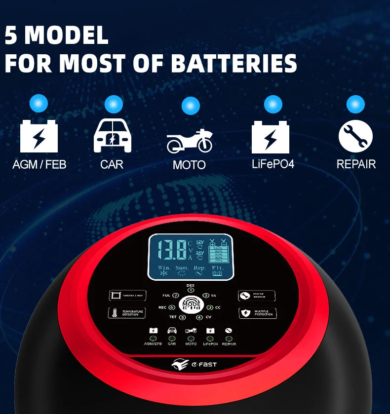 The TK-1500 is a powerful fully automatic battery charger, offering two charging modes: 12V/20A and 24V/10A. It is specifically designed for automobiles, trucks, motorcycles, boats, lawn mowers, SUVs, RVs, tractors, and all kinds of scooters. Whether it's traditional lead-acid batteries (flooded, AGM, gel, deep cycle, calcium batteries), or advanced lithium iron phosphate (LiFePO4) and lithium-ion batteries, the TK-1500 can intelligently identify and match the best charging curve, truly achieving multi-purpose functionality in one device.