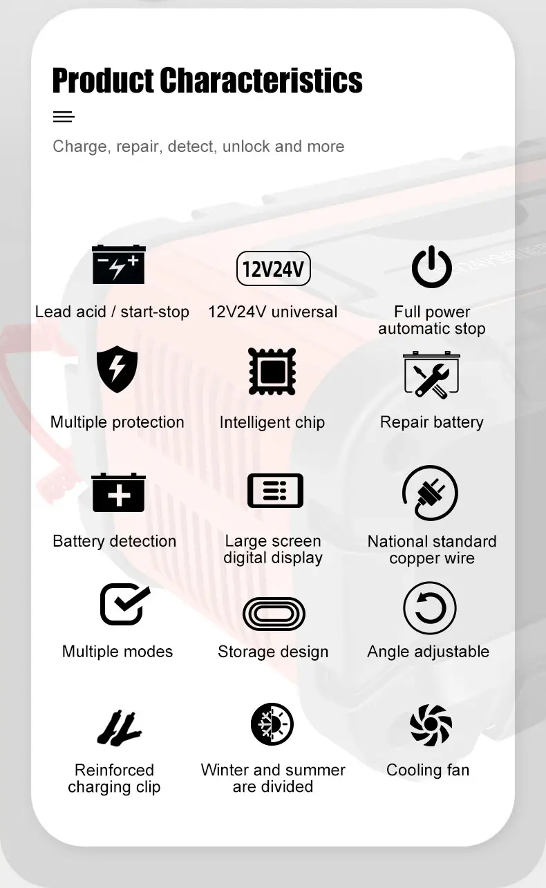 · Smart automatic detection: Automatically identifies battery type and applies the correct charging mode