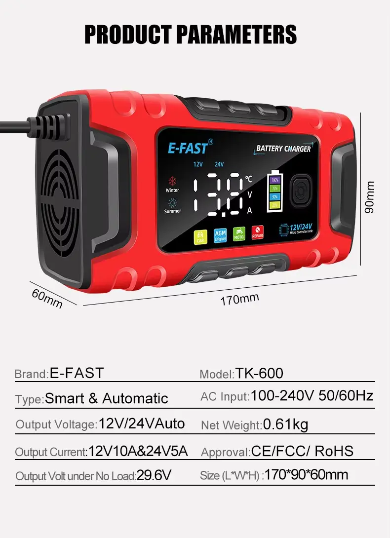 High-Quality E-Fast TK-600 fully automatic with Pulse Repair Technology 12V10A 24V5A lead acid lifepo4 battery charger for car |