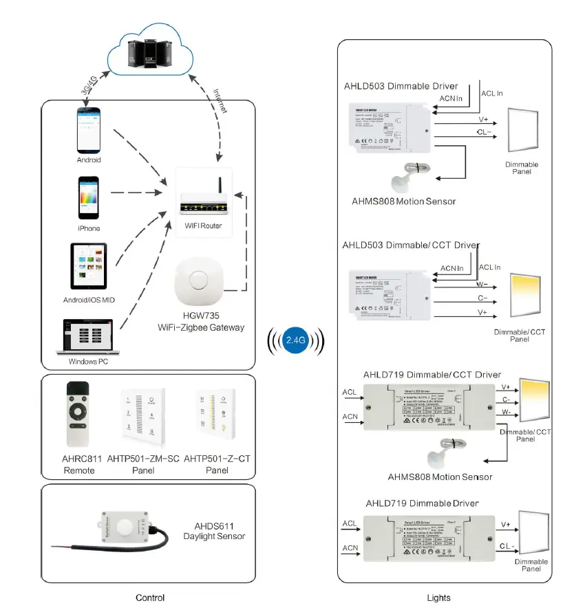 * Zigbee wireless control: smartphone, tablet, PC, wall switch, remote control